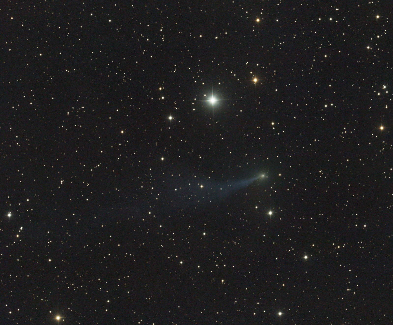 Instrumente:ZeitgleichKeller 340mm Hypergraph Primärfokus 1096mm Brennweite mit QHY11 CCD fuer Luminanz BilderNewton 305mm mit 3 “ ASA Wynekorrektor bei 1186mm Brennweite und Sony Alpha 7 fuer RGB Bilder17:33 - 18:33 UT / 29x2min / RGB Iso 800 / aufaddiert auf den Kometen / Sternfeld einkopiert
