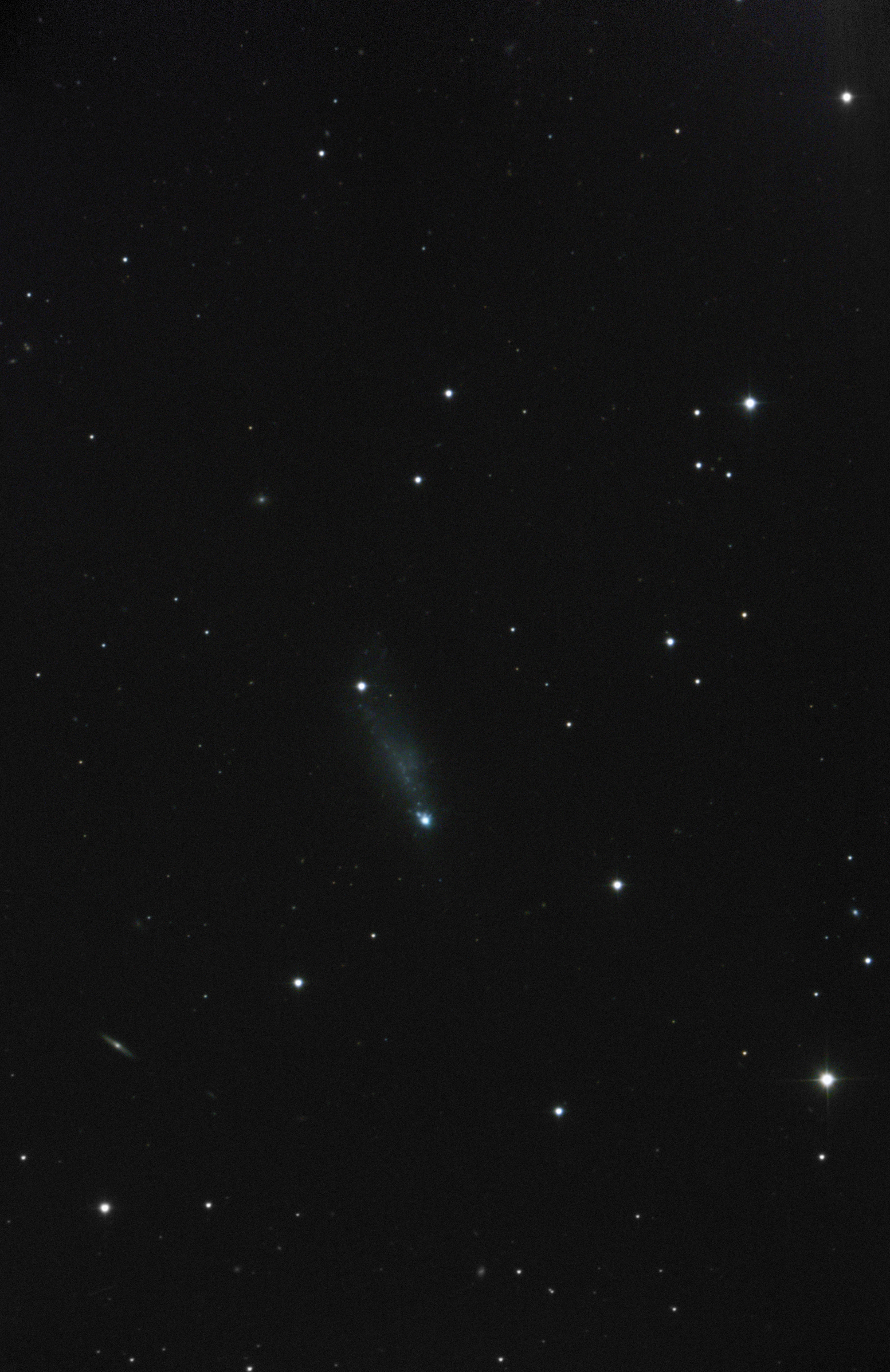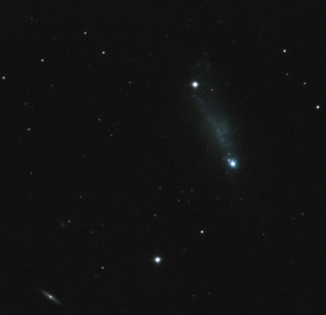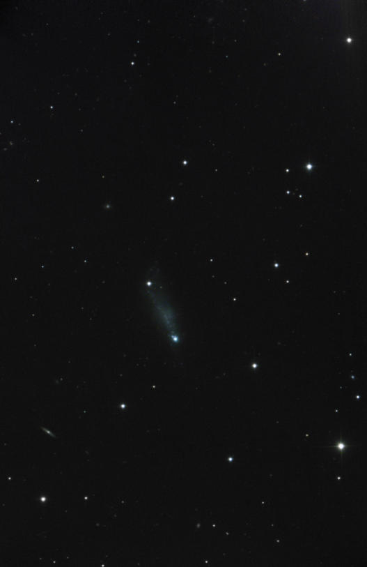 Auffällig ist bei dieser Galaxie das sehr helle blaue Gebilde am südlichen Ende, das fast an einen Kometenkern erinnert.
