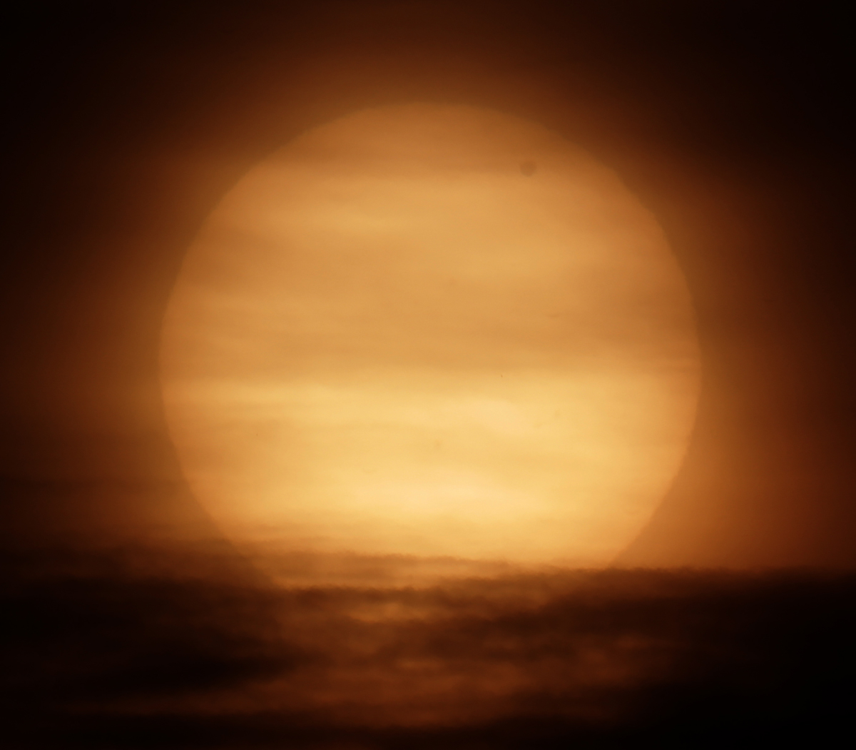 Dieses Bild zeigt die Sonne mit der Venus in dem schmalen wolkenfreien Streifen
